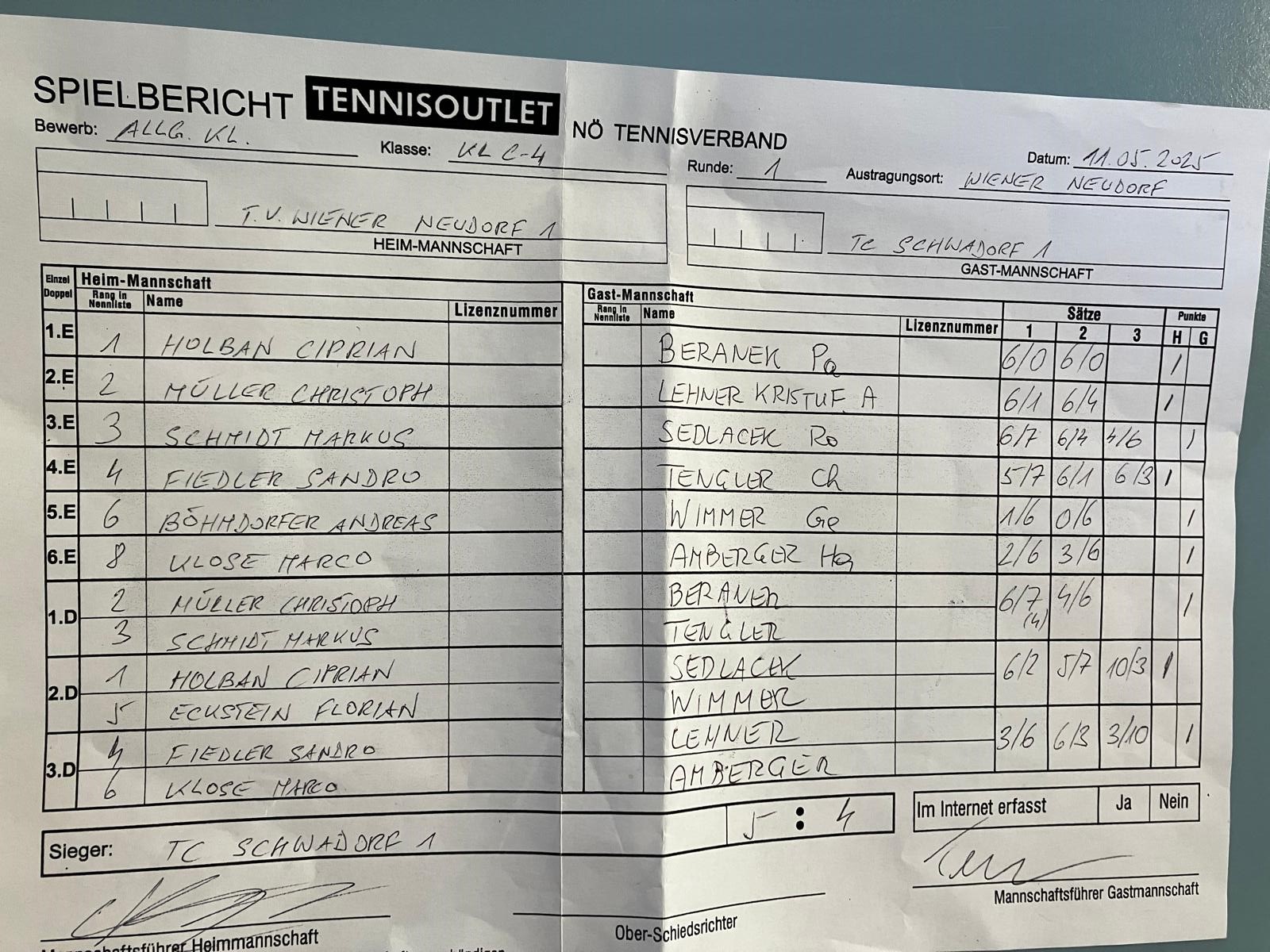 Protest TV Wr. Neudorf gegen die Aufstellung im Spiel gegen TC Schwadorf vom 11.5.2025