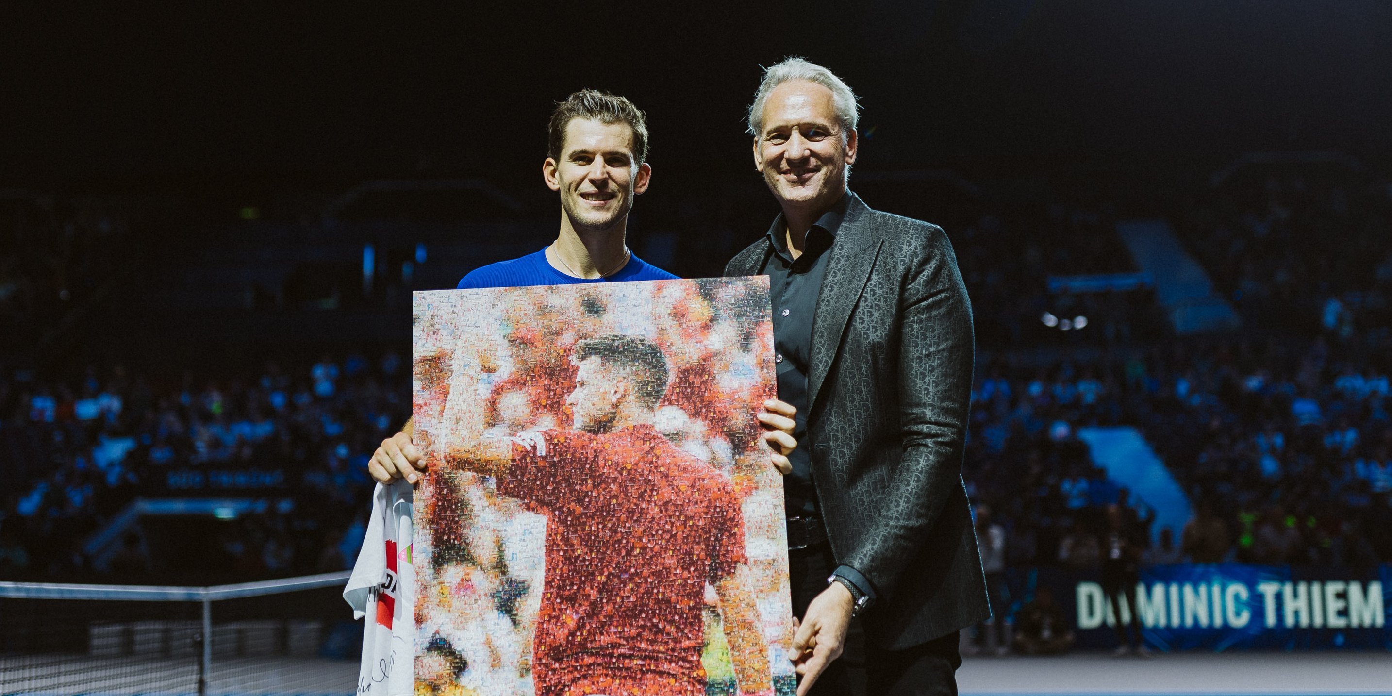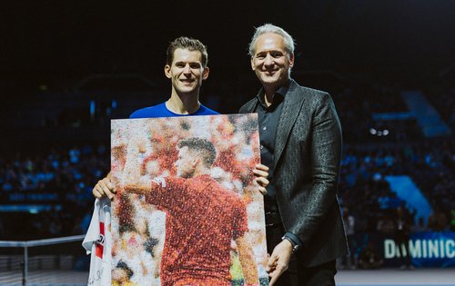Auch das ÖTV-Team mit Präsident Martin Ohneberg, Geschäftsführer Wirtschaft Thomas Schweda, Eventmanagerin und Davis-Cup-Teammanagerin Tamara Schandl und Sekretärin Katharina Wagner stellte sich beim Niederösterreicher als Gratulant:innen ein. Aus den Händen von ÖTV-Präsident Ohneberg erhielt Thiem ein Mosaikbild, bestehend aus über 300 kleinen Fotos von Thiem aus dem Davis Cup, sowie ein Österreich-Teamshirt mit Aufdruck „Danke, Domi“. Auf der Rückseite eine Auflistung aller Davis-Cup-Einsätze Thiems, auf der Vorderseite signiert vom ÖTV-Team und von Thiems einstigen Spielerkollegen im Davis-Cup-Team.
