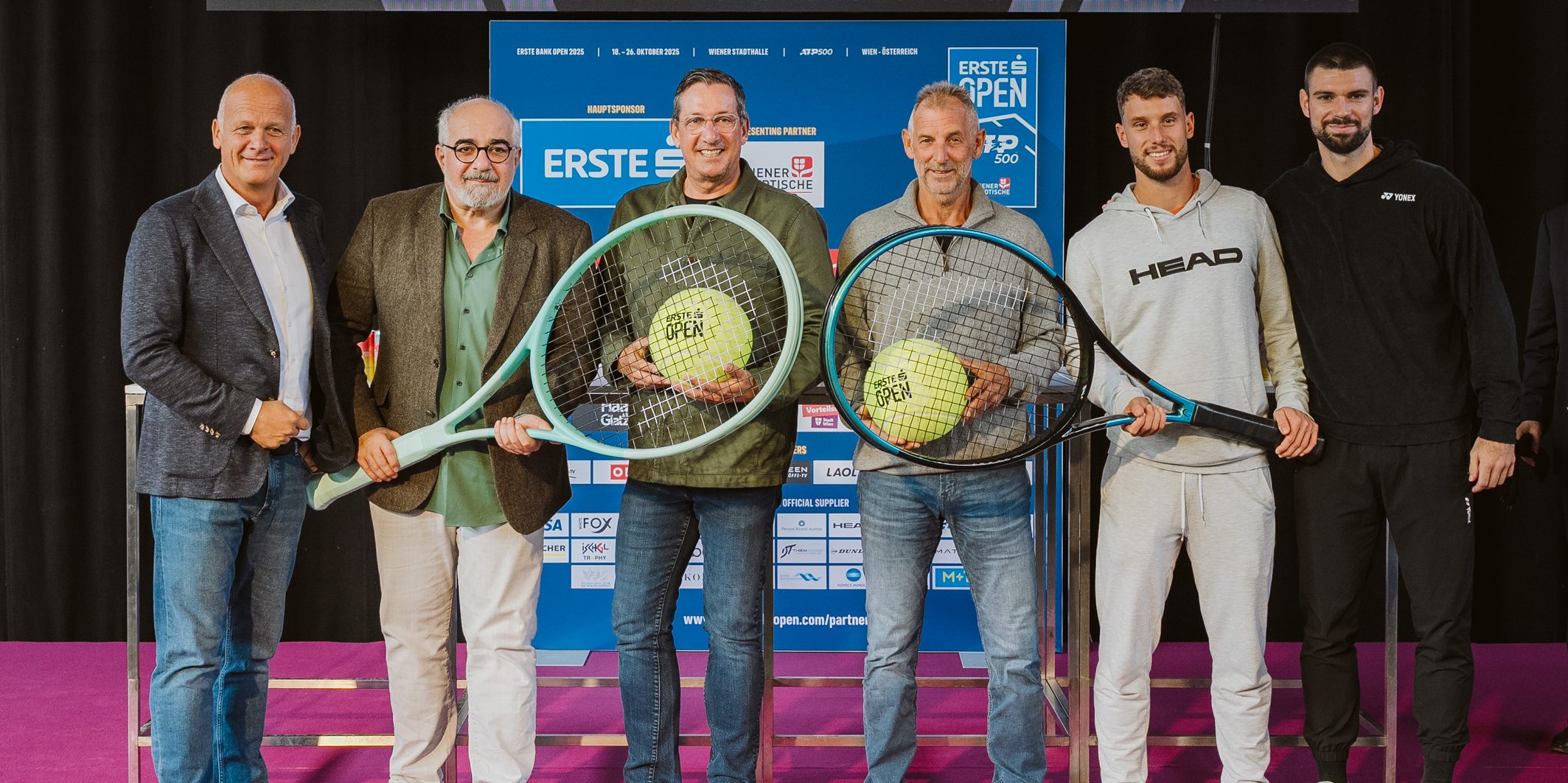 Bei der Hauptbewerbsauslosung in der Marx Halle von links nach rechts: Herwig Straka (Turnierdirektor), Michael Niavarani (Kabarettist), Viktor Gernot (Kabarettist), Thomas Muster (Turnierbotschafter), Filip Misolic, Jurij Rodionov.