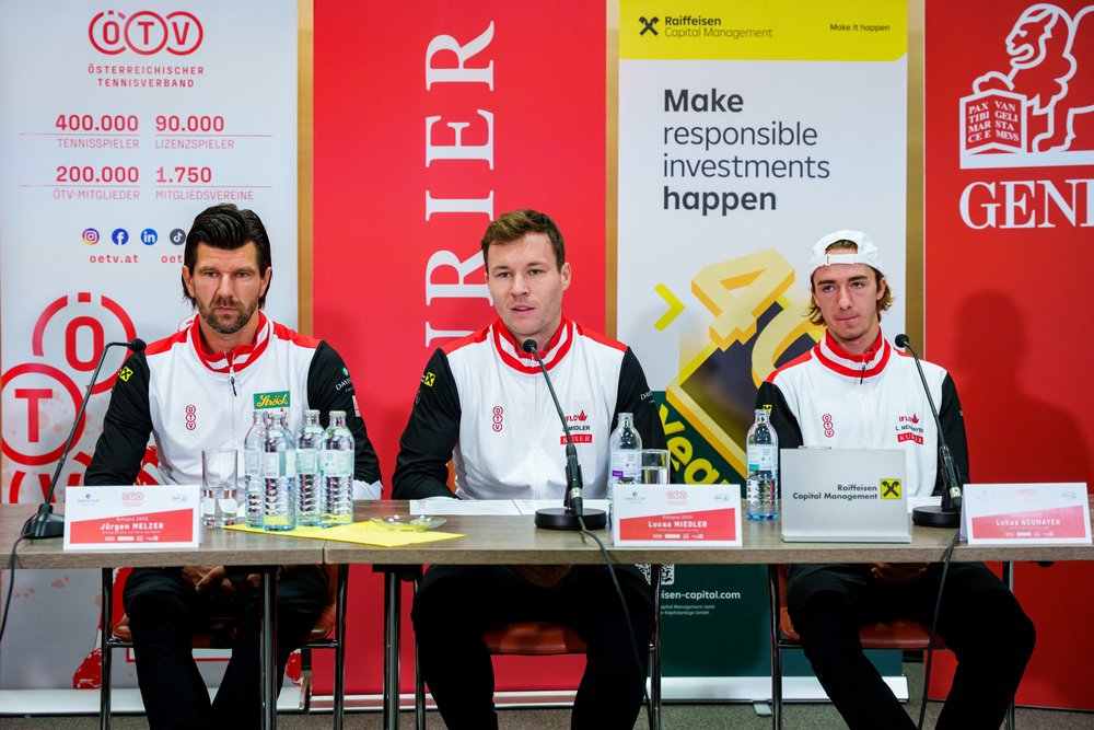 Auf geht’s nach Bologna! Einen Tag vor der Abreise zu den Davis Cup Final 8 (18. bis 23. November), wo Österreich im Viertelfinale am Mittwoch um 16:00 Uhr (live auf ORF 1) der zweimalige Titelverteidiger und Gastgeber Italien erwartet, hat sich das KURIER Austria Davis Cup Team am Freitag nochmals allen Fragen der heimischen Medien gestellt. Und zwar im Zuge einer Pressekonferenz in Wien-Döbling bei Raiffeisen Capital Management, das mit Namenssponsor KURIER und Generali als einer von drei Partnern von Österreichs Herrennationalmannschaft beim Finalturnier der besten acht Nationen der Welt firmiert. ÖTV-Präsident Martin Ohneberg, ÖTV-Sportdirektor und -Davis-Cup-Teamkapitän Jürgen Melzer, ÖTV-Geschäftsführer Wirtschaft Thomas Schweda sowie die Davis-Cup-Helden Lukas Neumayer und Lucas Miedler gaben dabei gemeinsam mit Hannes Cizek, CEO von Raiffeisen Capital Management, einen sportlichen Ein- und Ausblick aufs bevorstehende, gewaltige Highlight – das sicherlich größte in der rot-weiß-roten Tennissaison 2025.