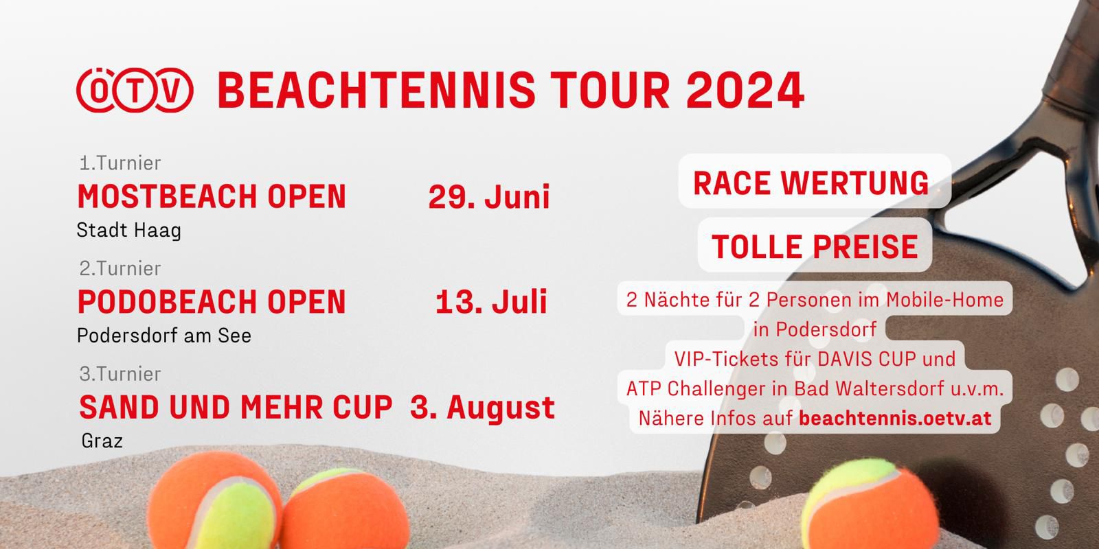 Die Beachtennis-Szene gibt mit der neuen Turnierserie mit Stopps in Haag, Podersdorf am See und Graz wieder ein kräftiges Lebenszeichen von sich. Diese Turniere zählen zur ÖTV-Race-Wertung, bei der ihr die Chance auf hochwertige Preise wie 2 Übernachtungen für 2 Personen in Podersdorf, VIP-Tickets für den Davis Cup Österreich – Türkei und den ATP-Challenger in Bad Waltersdorf oder Waterdrop-Packages habt. Gespielt wird im Doppelmodus, egal ob Männer- oder Damenpaarung oder als Mixed-Doppel.