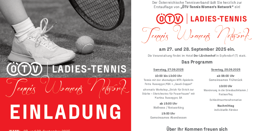 Am 27. und 28. September 2025 lädt der Österreichische Tennisverband zur Erstauflage des Tennis Women’s Network ins Hotel Der Lärchenhof in Erpfendorf (Tirol) ein. Zwei Tage voller Tennis, Inspiration und Networking erwarten die Teilnehmerinnen – ob beim „Gaudi-Doppel“ mit Ex-WTA-Spielerin Petra Russegger oder beim kreativen Sketchnotes-Workshop mit Martina Russegger.