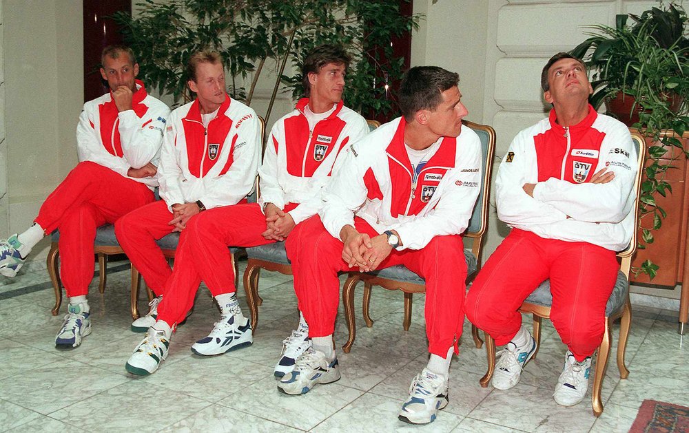 Österreichs Erfolgsteam 1995, von links nach rechts: Thomas Muster, Gilbert Schaller, Gerald Mandl, Alexander Antonitsch und der leider viel zu früh verstorbene Muster-Manager und Davis-Cup-Kapitän Ronnie Leitgeb.