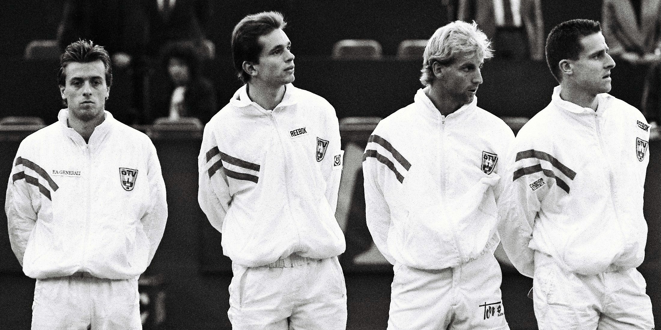 Österreichs drei Musketiere im Jahr 1990: Horst Skoff (ganz links), Thomas Muster (3. von links) und Alexander Antonitsch (ganz rechts). Zudem gehörte gegen Italien damals Thomas Buchmayer (2. von links) zum Erfolgskader.