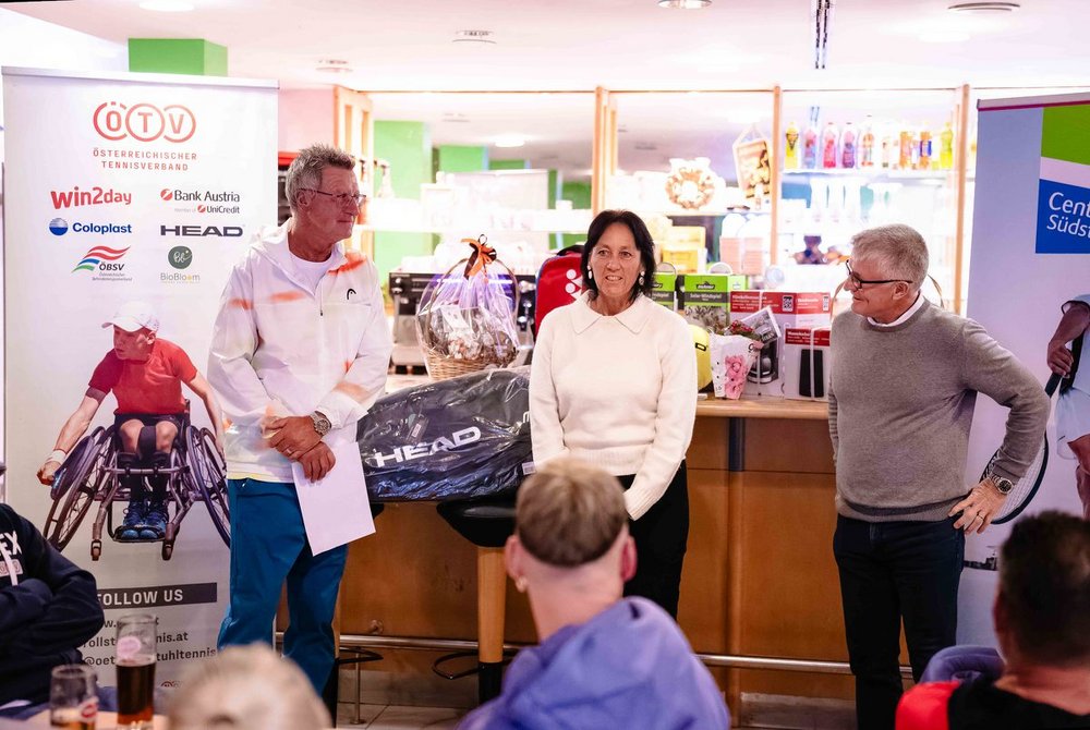 Nach einer Stärkung mit einem hervorragenden Grillbüffet von Tom’s „Tut Gut“-Gastronomiebetrieb wurde die Sieger:innenehrung von ÖTV-Geschäftsführer Wirtschaft Thomas Schweda und NÖTV-Präsidentin Petra Schwarz durchgeführt, gemeinsam mit Veranstalter Christian Roth, der danach auch die Tombola leitete. Die Gewinner:innen und Platzierten erhielten edle Weine vom Gut Lukas Markowitsch. Bei der Tombola gab es Karten für die Erste Bank Open in der Wiener Stadthalle und für Erste Bank Open 2 Go in der Marx Halle, Kabaretttickets für das CasaNova Vienna, HEAD-Tasche und -Racket, einen Yonex-Rucksack, Dehner-Gutscheine, einen Tom’s „Tut Gut“-Restaurantgutschein, feine Süßwaren vom Schoko Laden am Schwedenplatz und von Bonbons Neubaugasse, TennisPoint-Gutscheine, INTERSPAR-Küchengeräte, ein HEAD-Paket von Center Court Südstadt und einen ÖTV-Jumboball, signiert vom KURIER Austria Davis Cup Team, zu gewinnen. Der gesamte Reinerlös der Veranstaltung kommt auch in diesem Jahr dem ÖTV-Rollstuhltennisreferat zugute.